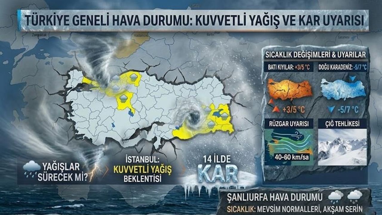 Yağışların genel olarak sağanak, Doğu Anadolu'nun doğusunda ise karla karışık yağmur ve kar şeklinde olması bekleniyor. Özellikle Marmara’nın doğusu, Batı Karadeniz’in batısı, Doğu Anadolu’nun güneydoğusu ile Siirt, Batman, Rize, Artvin ve Ardahan çevrelerinde yağışların şiddetini artıracağı öngörülüyor.
