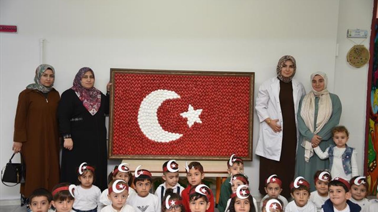Şanlıurfa'nın Siverek ilçesinde anaokulu öğretmeni, velilerle 29 Ekim Cumhuriyet Bayramı anısına atık malzemelerden Türk bayrağı yaptı.