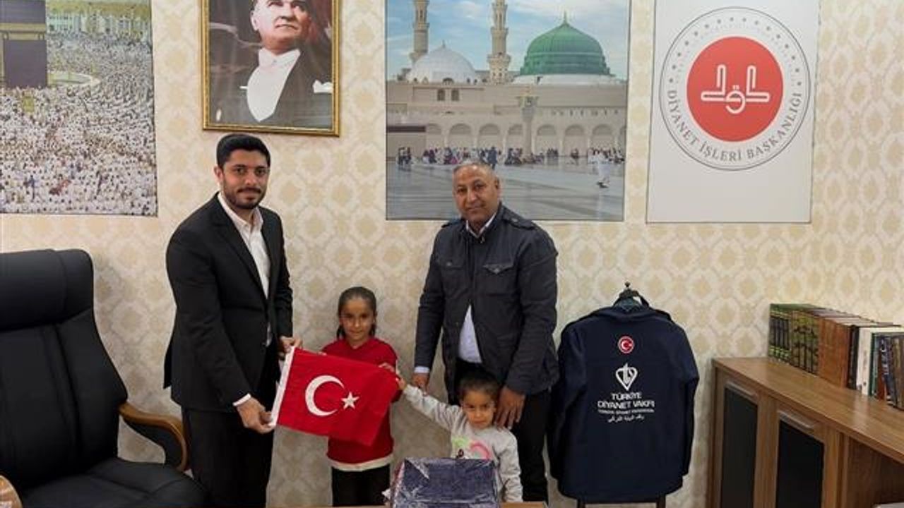 Müftü Ertürk, Debe ailesini ve çocukları Dilek ile Reyhan'ı makamında misafir etti, çocuklara çeşitli hediyeler takdim etti.
